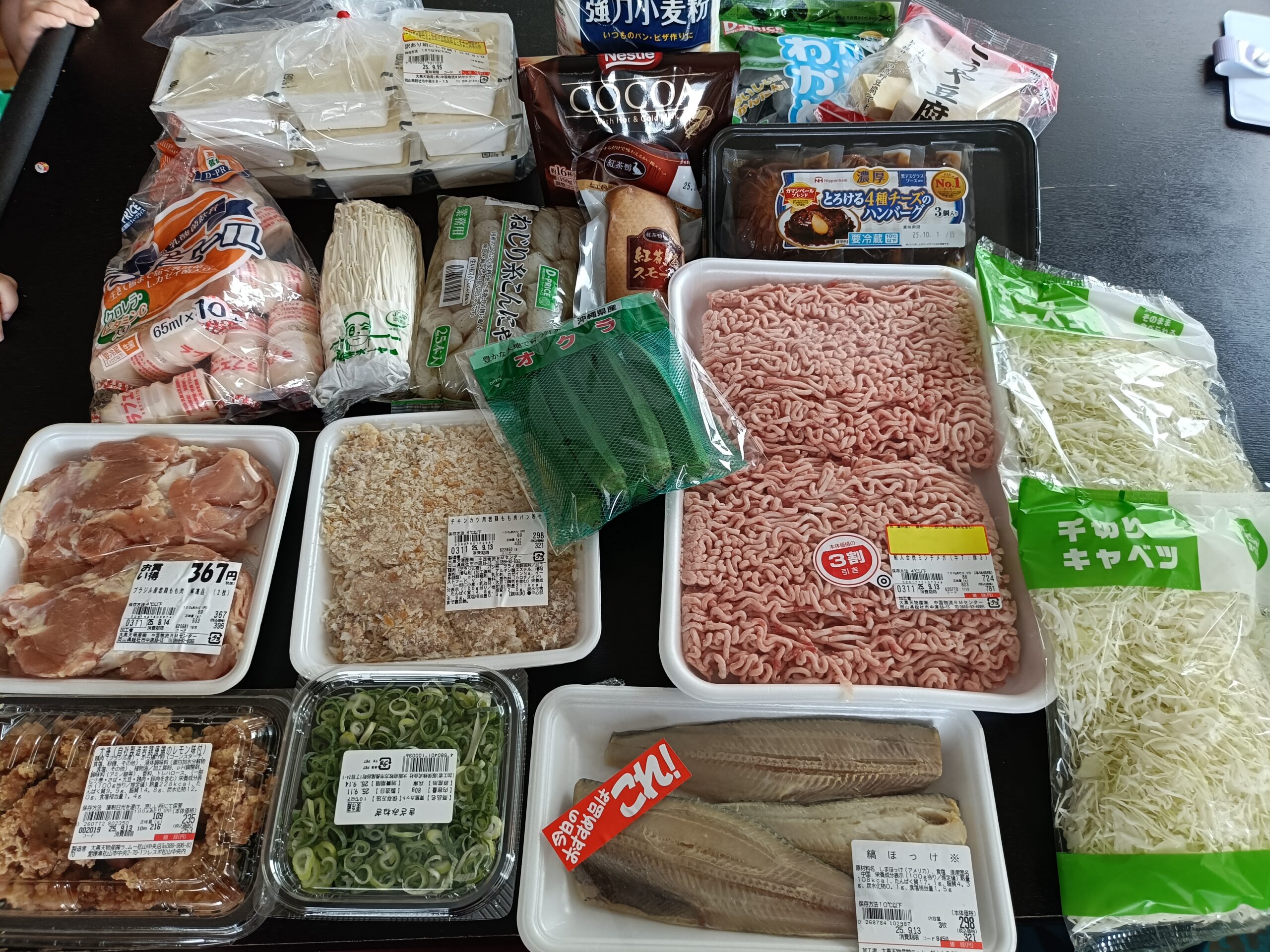 左奥の白い物体はお豆腐なのですが、9つも入って70円以下‼ お安いですよね~🉐‼️ パン作りもよくするので、強力粉やココアなんかも買いました☆ バター買うのをすっかり忘れてましたー😭😭😭笑